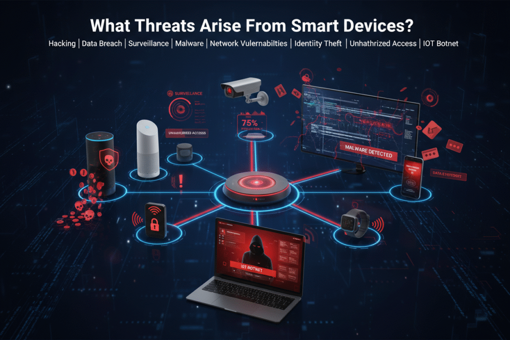 Data exploitation poses serious risks. Voice assistants and thermostats collect personal information. Hackers use that data for fraud, stalking, or identity theft. Device hijacking allows remote control. Attackers access cameras, locks, or vacuums to spy or manipulate your home. Weak credentials create easy entry points.
