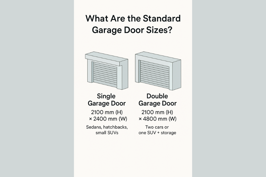 A: In Australia, the standard single garage door size is 2100 mm high × 2400 mm wide. Many homeowners choose widths up to 3150 mm for larger SUVs.
